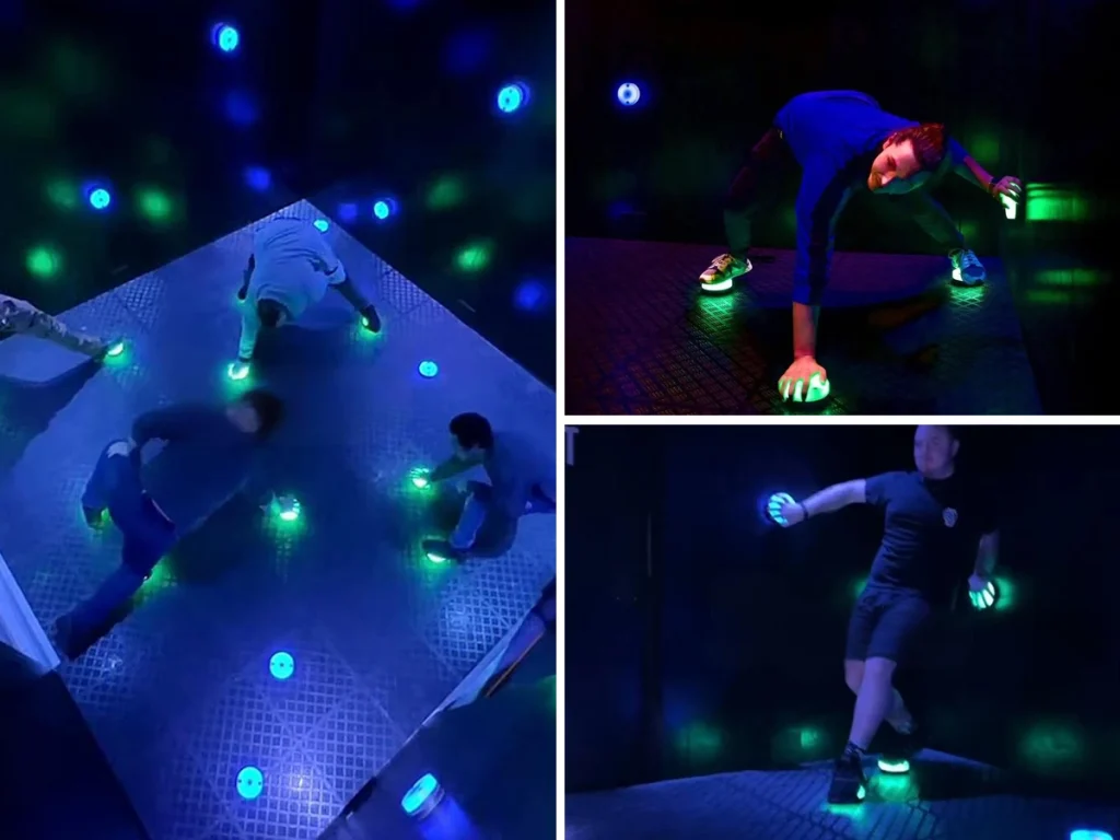 - The buttons light up randomly, with changing colors and positions, testing players’ reaction speed and body coordination.