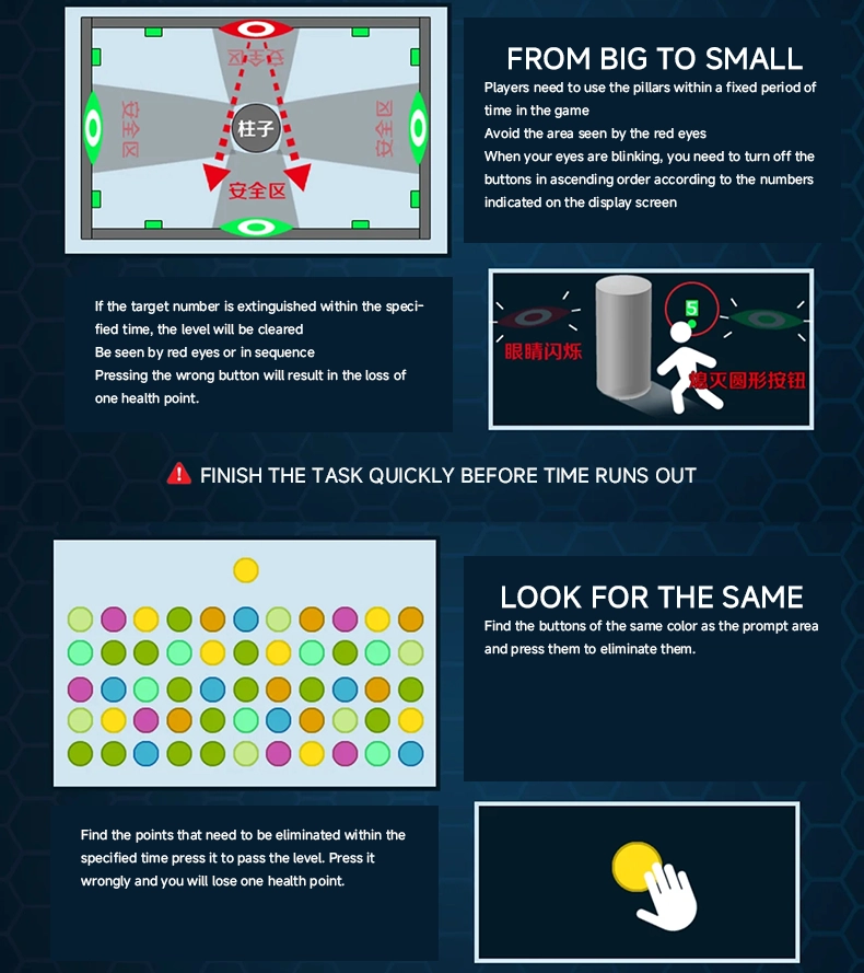 Hide behind pillars when the demon’s eye is open, and complete challenge tasks when the eye is closed. If the eye sees you, you’ll lose health points. The backend system allows customization of game duration, health points, and other settings.